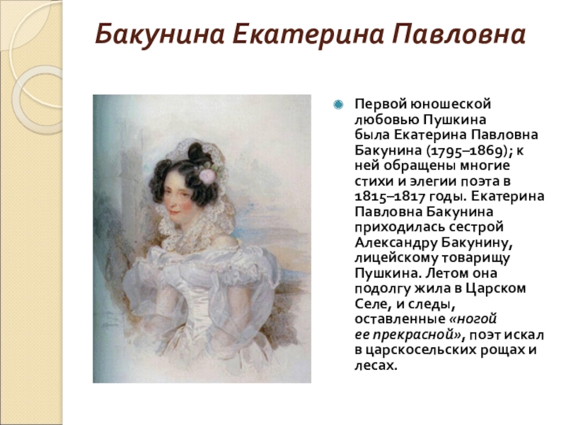 Первой юношеской любовью Пушкина была Екатерина Павловна Бакунина (1795–1869); к