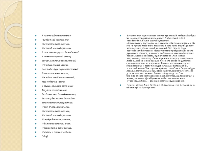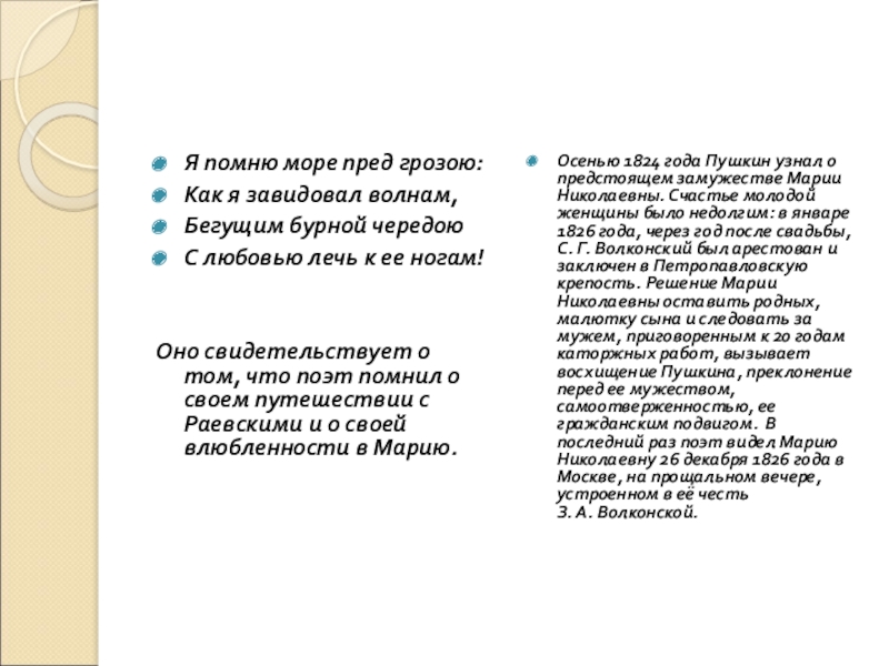 — дочь прославленного героя Отечественной войны генерала Н. Н. Раев-ского, жена декабриста С. Г. Волконского, одна из замечательных женщин своего времени. Пушкин был дружен с семьей Раевских и знал Марию Николаевну еще совсем юной девочкой, когда он вместе с Раевскими путешествовал по Кавказу и Крыму. Яркая индивидуальность молодой девушки, пылкость и естественность характера, незаурядность натуры пленили поэтическое воображение Пушкина. Его чувство было глубоким и сокровенным. Образ Марии Раевской, этот «души неясный идеал», запечатлен в стихотворениях «Редеет облаков летучая гряда…», «Погасло дневное светило…», «Фонтану Бахчисарайского дворца», «На холмах Грузии…»; ее внешний облик мы узнаем в героине «Полтавы»; именно ей Пушкин посвятил свое лирическое отступление в I главе романа «Евгений Онегин»: