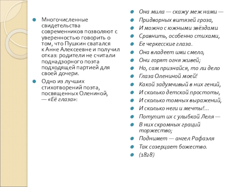 Одно из лучших стихотворений поэта, посвященных Олениной, — «Её глаза»: