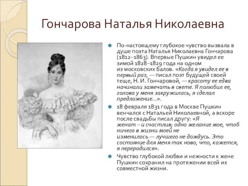 Гончарова (1812–1863). Впервые Пушкин увидел ее зимой 1828–1829 года на одном из московских балов. «Когда я увидел ее в первый раз, — писал поэт будущей своей теще, Н. И. Гончаровой, — красоту ее едва начинали замечать в свете. Я полюбил ее, голова у меня закружилась, я сделал предложение…».