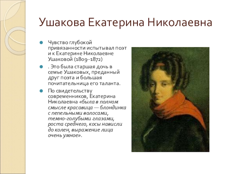 Одно время Пушкин собирался связать свою судьбу с Ушаковой, но неожиданно вспыхнувшее чувство к Анне Алексеевне Олениной, а потом и знакомство с Натальей Николаевной Гончаровой помешали этому.