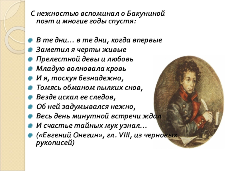С нежностью вспоминал о Бакуниной поэт и многие годы спустя: