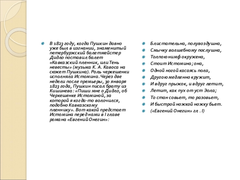 балетмейстер Дидло поставил балет«Кавказский пленник, или Тень невесты» (музыка К. А. Кавоса на сюжет Пушкина). Роль черкешенки исполняла Истомина. Через две недели после премьеры, 30 января 1823 года, Пушкин писал брату из Кишинева: «Пиши мне о Дидло, об Черкешенке Истоминой, за которой я когда-то волочился, подобно Кавказскому пленнику». Вот какой предстает Истомина перед нами в I главе романа «Евгений Онегин»: