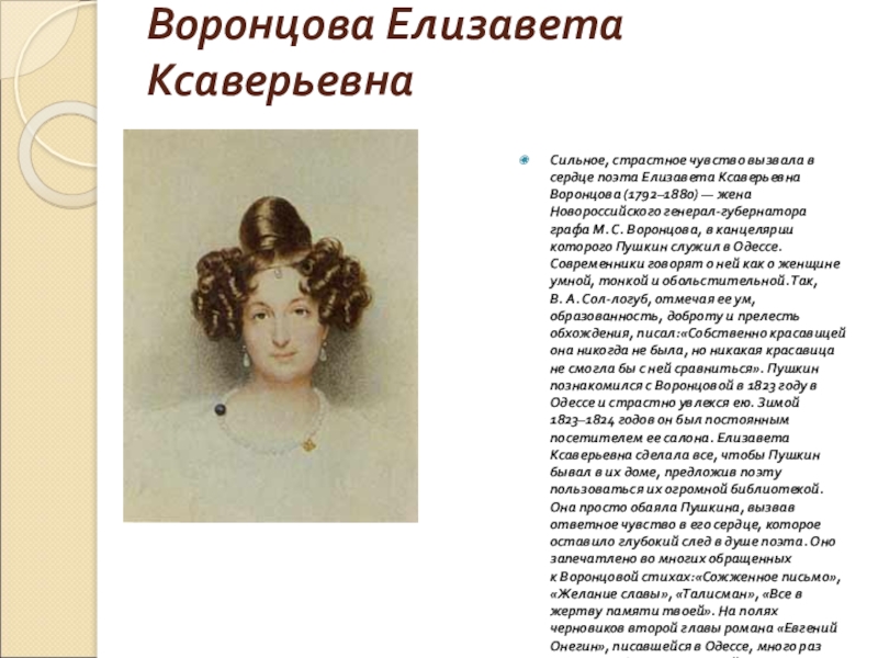 Воронцова (1792–1880) — жена Новороссийского генерал-губернатора графа М. С. Воронцова, в канцелярии которого Пушкин служил в Одессе. Современники говорят о ней как о женщине умной, тонкой и обольстительной. Так, В. А. Сол-логуб, отмечая ее ум, образованность, доброту и прелесть обхождения, писал:«Собственно красавицей она никогда не была, но никакая красавица не смогла бы с ней сравниться». Пушкин познакомился с Воронцовой в 1823 году в Одессе и страстно увлекся ею. Зимой 1823–1824 годов он был постоянным посетителем ее салона. Елизавета Ксаверьевна сделала все, чтобы Пушкин бывал в их доме, предложив поэту пользоваться их огромной библиотекой. Она просто обаяла Пушкина, вызвав ответное чувство в его сердце, которое оставило глубокий след в душе поэта. Оно запечатлено во многих обращенных к Воронцовой стихах:«Сожженное письмо», «Желание славы», «Талисман», «Все в жертву памяти твоей». На полях черновиков второй главы романа «Евгений Онегин», писавшейся в Одессе, много раз появлялся бегло очерченный пером ее профиль.