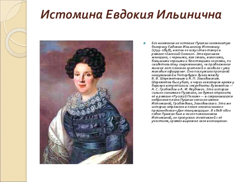 Истомину (1799–1848), воспев ее искусство танца в романе «Евгений Онегин». Эта красивая женщина, с черными, как смоль, волосами, большими черными и блестящими глазами, по свидетельству современника, «в продолжение многих лет пленяла зрителей и сводила с ума молодых офицеров». Она послужила причиной нашумевшей в Петербурге дуэли между В. В. Шереметевым и А. П. Завадовским. Шереметев был убит, а через некоторое время у барьера встретились секунданты дуэлянтов — А. С. Грибоедов и А. И. Якубович. Эта история сильно занимала Пушкина, он думал отразить её в романе «Русский Пелам» — в сохранившихся набросках плана Пушкин записал имена Истоминой, Грибоедова, Заводовского. Эта же история отражена в плане ненаписанного произведения «Две танцовщицы». В 1818–1820 годах Пушкин был в числе поклонников Истоминой, не пропускал спектаклей с её участием, громко выражал свое восхищение.