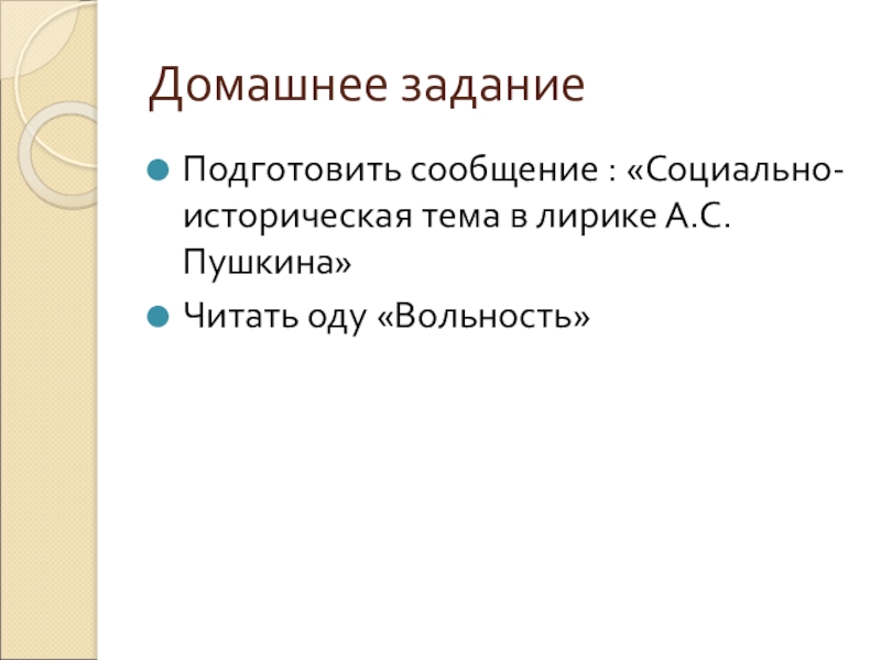 Подготовить сообщение : «Социально-историческая тема в лирике А.С.Пушкина»