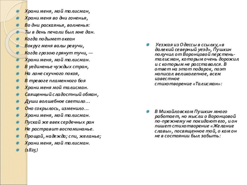 Уезжая из Одессы в ссылку,«в далекий северный уезд», Пушкин получил от Воронцовой перстень-талисман, которым очень дорожил и с которым не расставался. В ответ на этот подарок, поэт написал великолепное, всем известное стихотворение «Талисман»: