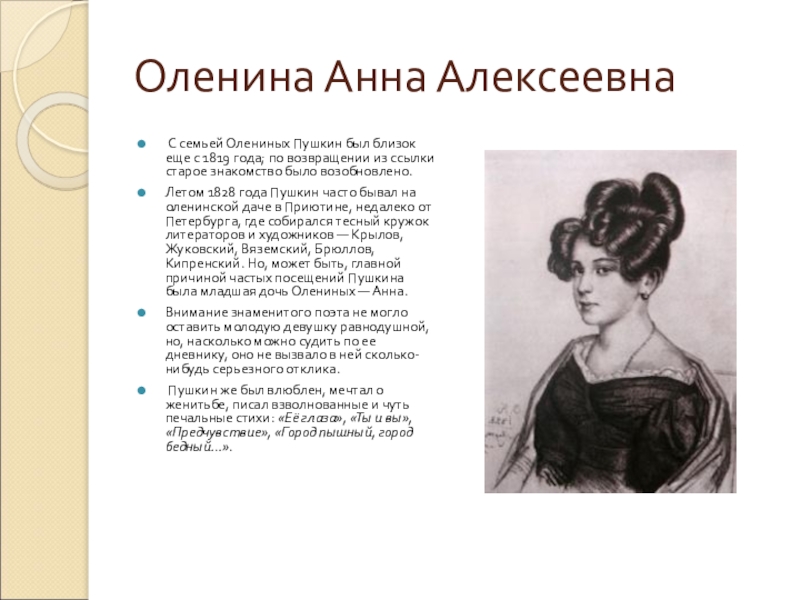 Летом 1828 года Пушкин часто бывал на оленинской даче в Приютине, недалеко от Петербурга, где собирался тесный кружок литераторов и художников — Крылов, Жуковский, Вяземский, Брюллов, Кипренский. Но, может быть, главной причиной частых посещений Пушкина была младшая дочь Олениных — Анна.