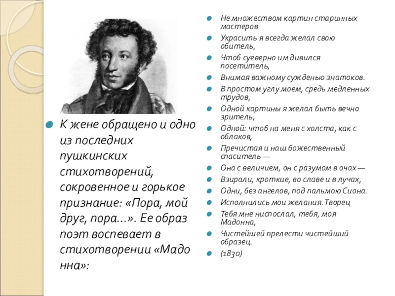 признание: «Пора, мой друг, пора…». Ее образ поэт воспевает в стихотворении «Мадонна»: