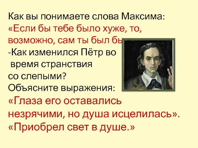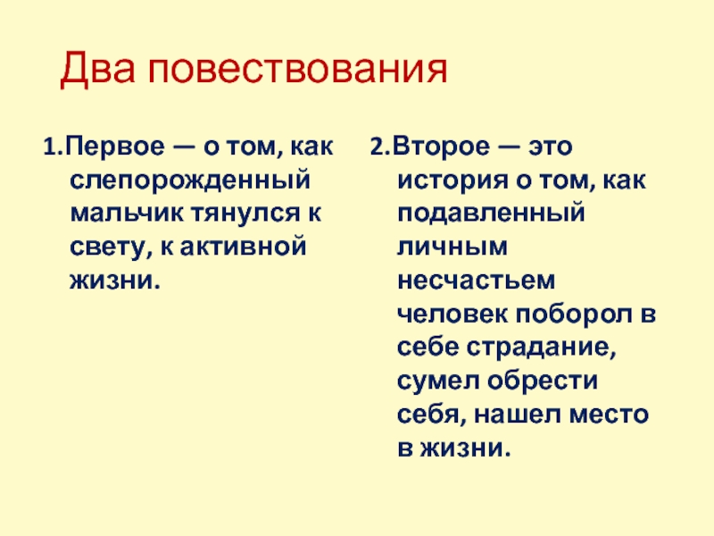 2.Второе — это история о том, как подавленный личным несчастьем человек поборол в себе страдание, сумел обрести себя, нашел место в жизни.
