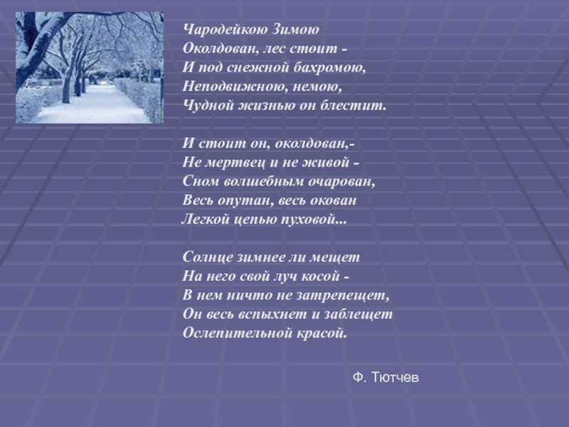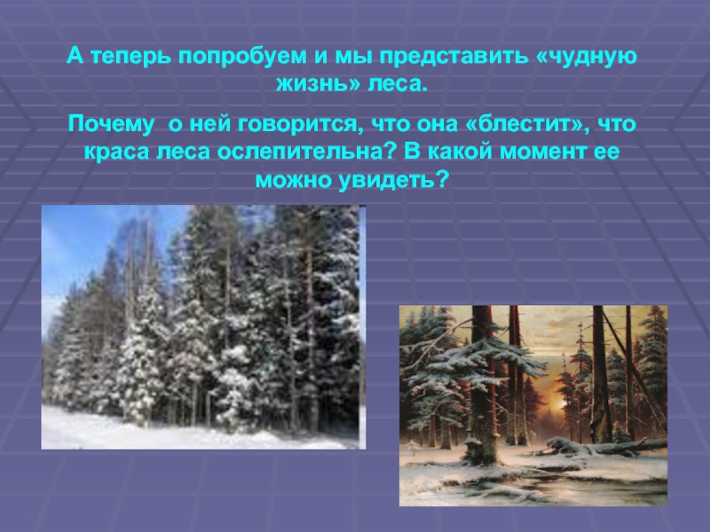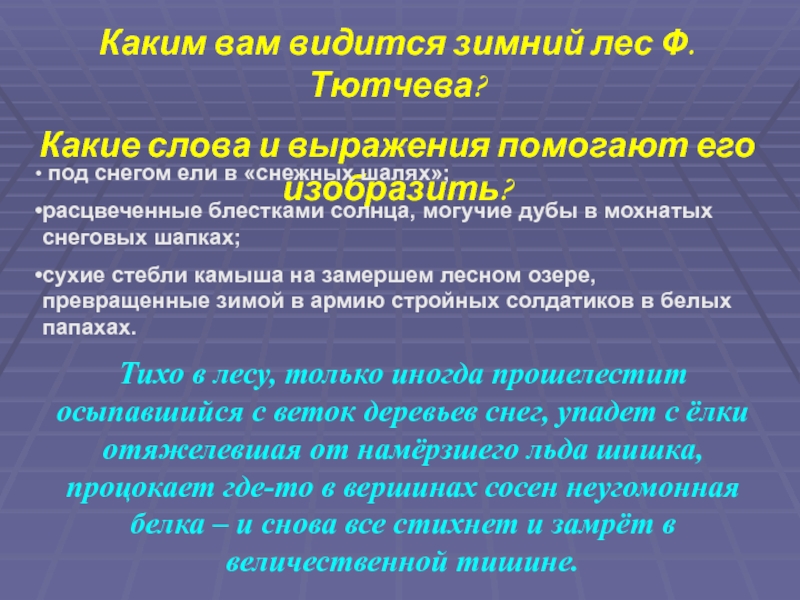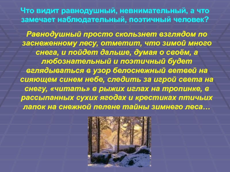 Образ «легкой пуховой» цепи помогает представить сонное оцепенение зимнего леса.
