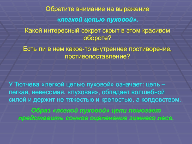 У Тютчева «легкой цепью пуховой» означает: цепь – легкая, невесомая. «пуховая», обладает волшебной силой и держит не тяжестью и крепостью, а колдовством.