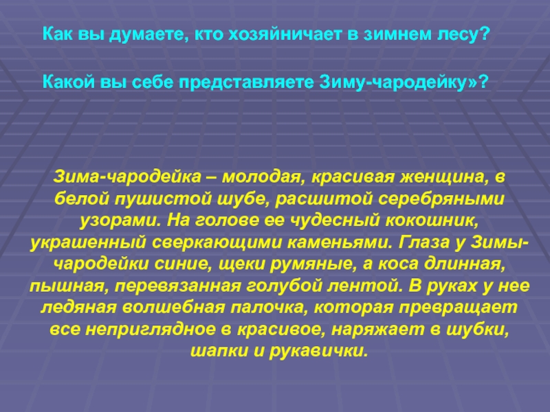 Зима-чародейка – молодая, красивая женщина, в белой пушистой шубе, расшитой серебряными узорами. На голове ее чудесный кокошник, украшенный сверкающими каменьями. Глаза у Зимы-чародейки синие, щеки румяные, а коса длинная, пышная, перевязанная голубой лентой. В руках у нее ледяная волшебная палочка, которая превращает все неприглядное в красивое, наряжает в шубки, шапки и рукавички.