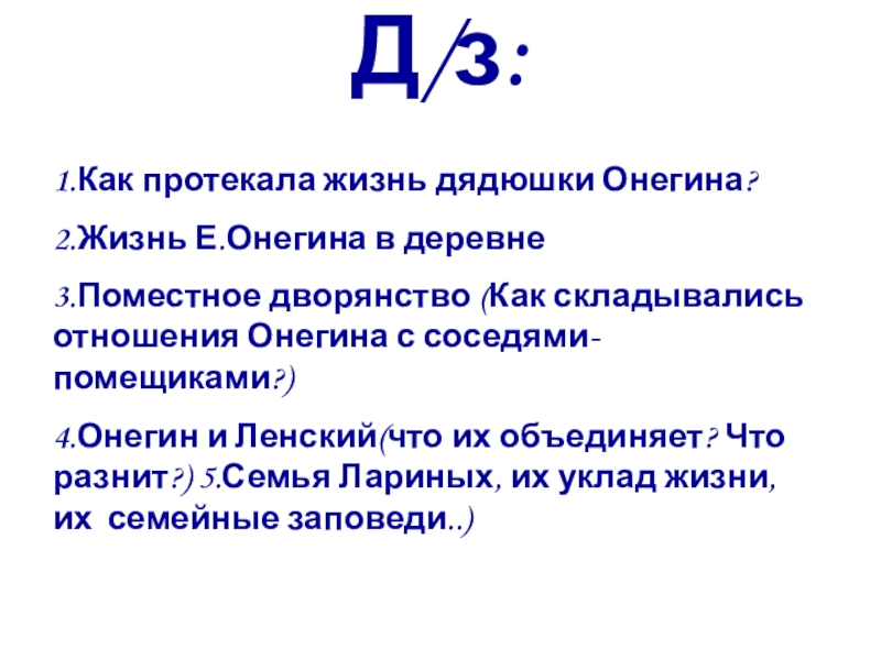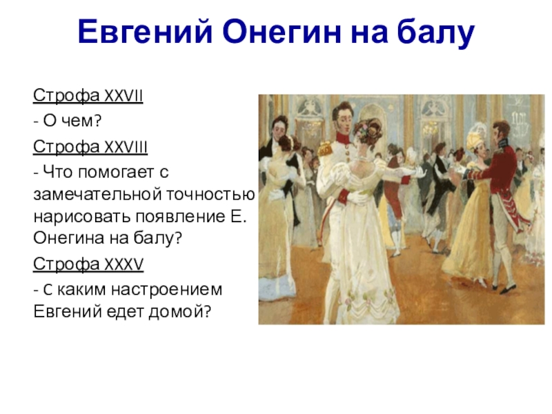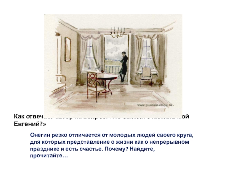 Онегин резко отличается от молодых людей своего круга, для которых представление о жизни как о непрерывном празднике и есть счастье. Почему? Найдите, прочитайте…