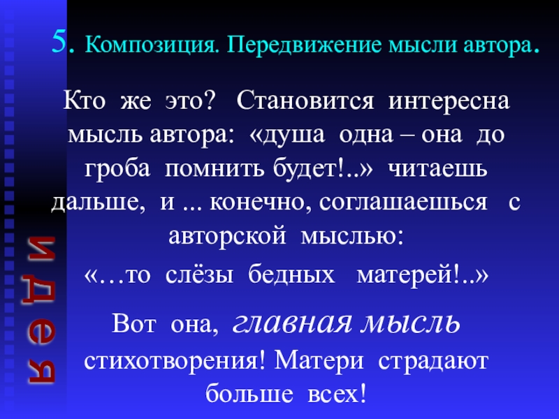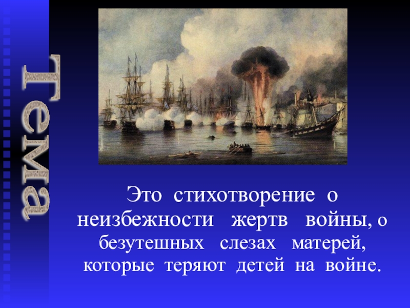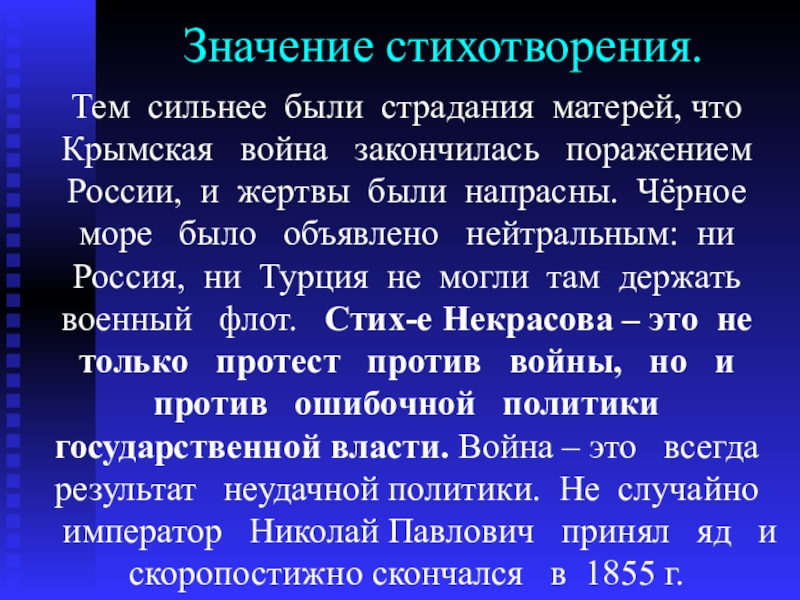Стих-е написано в 1856 г. под влиянием Крымской кампании 1854 – 1855 г.г., которая очень волновала Некрасова (одно время он сам стремился ехать на фронт), а также под впечатлением «Севастопольских рассказов Л.Н.Толстого.