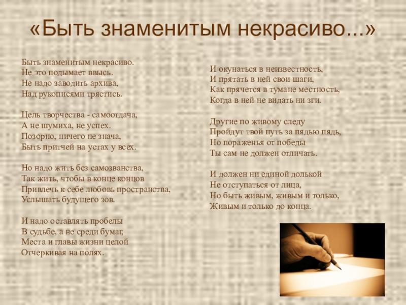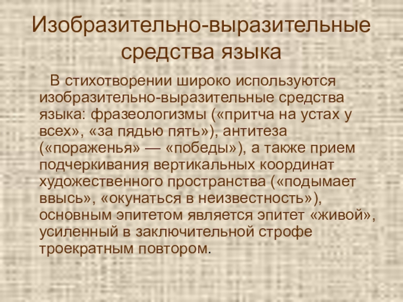 языка: фразеологизмы («притча на устах у всех», «за пядью пять»), антитеза («пораженья» — «победы»), а также прием подчеркивания вертикальных координат художественного пространства («подымает ввысь», «окунаться в неизвестность»), основным эпитетом является эпитет «живой», усиленный в заключительной строфе троекратным повтором.