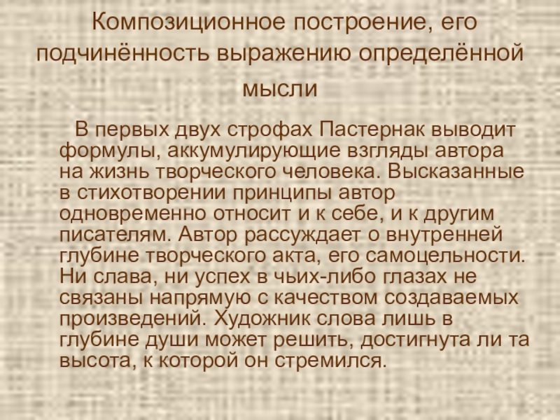 В первых двух строфах Пастернак выводит формулы, аккумулирующие взгляды автора на жизнь творческого человека. Высказанные в стихотворении принципы автор одновременно относит и к себе, и к другим писателям. Автор рассуждает о внутренней глубине творческого акта, его самоцельности. Ни слава, ни успех в чьих-либо глазах не связаны напрямую с качеством создаваемых произведений. Художник слова лишь в глубине души может решить, достигнута ли та высота, к которой он стремился.
