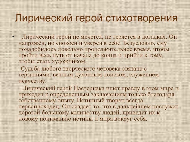 Лирический герой Пастернака ищет правду в этом мире и приходит к определенным заключениям только благодаря собственному опыту. Истинный творец всегда первопроходец. Он создает то, что в дальнейшем послужит дорогой большому количеству людей, приведет их к новому пониманию истины и мира вокруг себя.