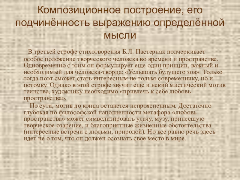 строфе стихотворения Б.Л. Пастернак подчеркивает особое положение творческого человека во времени и пространстве. Одновременно с этим он формулирует еще один принцип, важный и необходимый для человека-творца: «Услышать будущего зов». Только тогда поэт сможет стать интересным не только современнику, но и потомку. Однако в этой строфе звучит еще и некий мистический мотив таинства, художнику необходимо «привлечь к себе любовь пространства».
