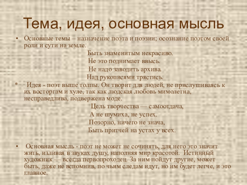 Основная мысль - поэт не может не сочинять, для него это значит жить, изливая в звуках душу, наполняя мир красотой. Истинный художник — всегда первопроходец. За ним пойдут другие, может быть, даже не вспомнив, по чьим следам идут, но им будет легче, и это главное.