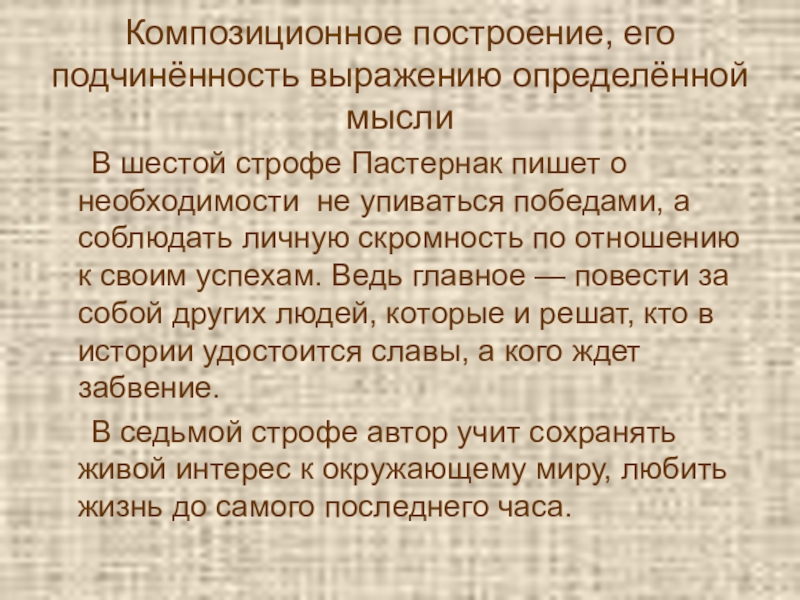 строфе Пастернак пишет о необходимости не упиваться победами, а соблюдать личную скромность по отношению к своим успехам. Ведь главное — повести за собой других людей, которые и решат, кто в истории удостоится славы, а кого ждет забвение.