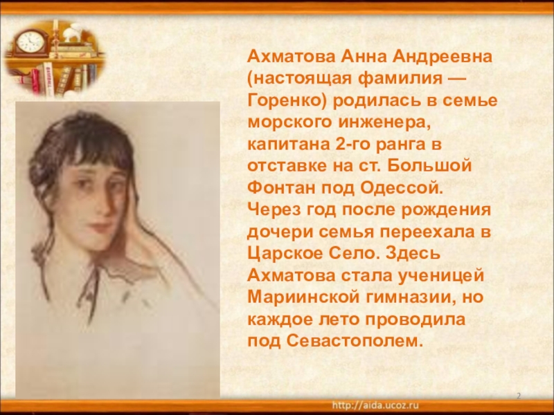 инженера, капитана 2-го ранга в отставке на ст. Большой Фонтан под Одессой. Через год после рождения дочери семья переехала в Царское Село. Здесь Ахматова стала ученицей Мариинской гимназии, но каждое лето проводила под Севастополем.
