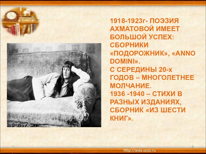 *1918-1923г- ПОЭЗИЯ АХМАТОВОЙ ИМЕЕТ БОЛЬШОЙ УСПЕХ: СБОРНИКИ «ПОДОРОЖНИК», «ANNO DOMINI». С СЕРЕДИНЫ 20-х ГОДОВ – МНОГОЛЕТНЕЕ МОЛЧАНИЕ.