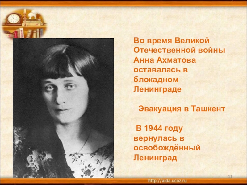 *Во время Великой Отечественной войны Анна Ахматова оставалась в блокадном Ленинграде Эвакуация в Ташкент В 1944 году