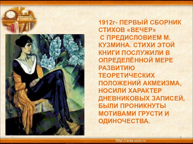 КНИГИ ПОСЛУЖИЛИ В ОПРЕДЕЛЁННОЙ МЕРЕ РАЗВИТИЮ ТЕОРЕТИЧЕСКИХ ПОЛОЖЕНИЙ АКМЕИЗМА, НОСИЛИ ХАРАКТЕР ДНЕВНИКОВЫХ ЗАПИСЕЙ, БЫЛИ ПРОНИКНУТЫ МОТИВАМИ ГРУСТИ И ОДИНОЧЕСТВА.