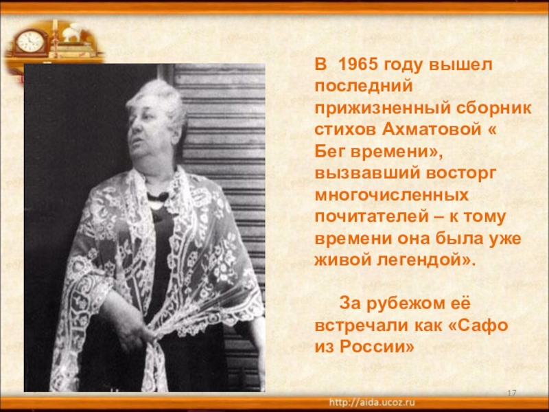 *В 1965 году вышел последний прижизненный сборник стихов Ахматовой « Бег времени», вызвавший восторг многочисленных почитателей –