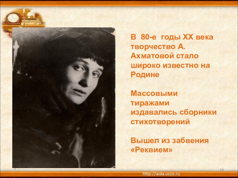 *В 80-е годы XX века творчество А.Ахматовой стало широко известно на РодинеМассовыми тиражами издавались сборники стихотворенийВышел из
