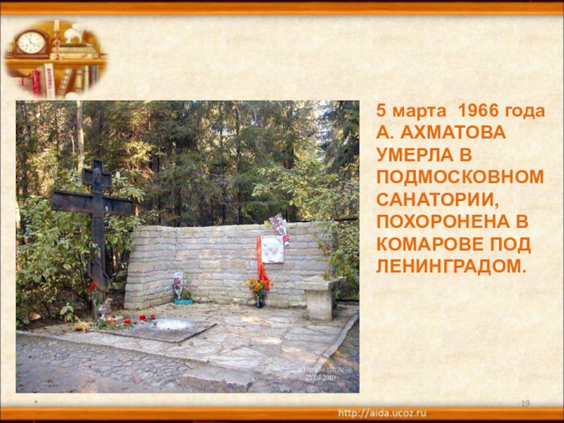 *5 марта 1966 года  А. АХМАТОВА УМЕРЛА В ПОДМОСКОВНОМ САНАТОРИИ, ПОХОРОНЕНА В КОМАРОВЕ ПОД ЛЕНИНГРАДОМ.