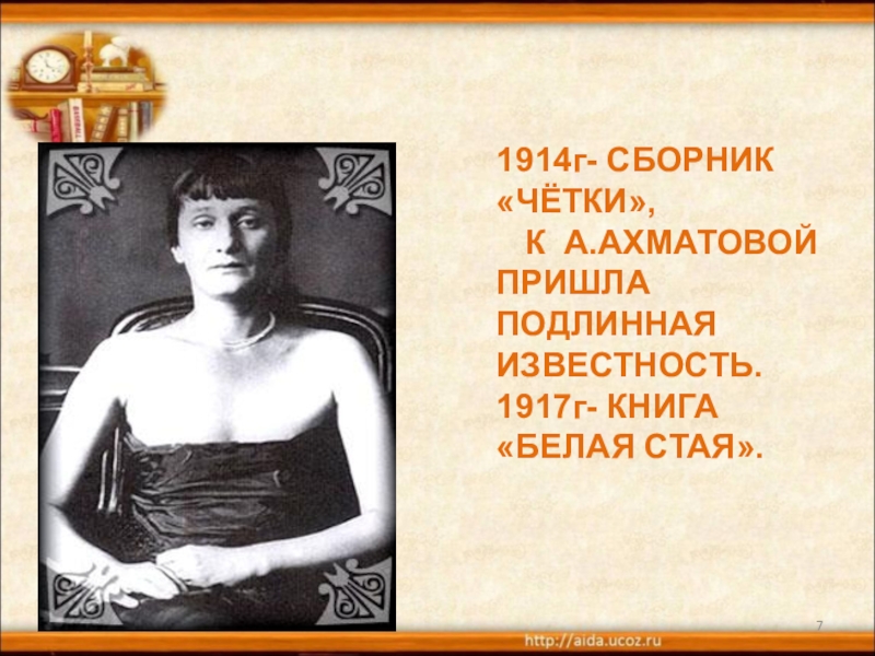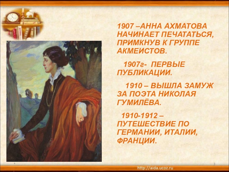 *1907 –АННА АХМАТОВА НАЧИНАЕТ ПЕЧАТАТЬСЯ, ПРИМКНУВ К ГРУППЕ АКМЕИСТОВ.   1907г- ПЕРВЫЕ ПУБЛИКАЦИИ.   1910