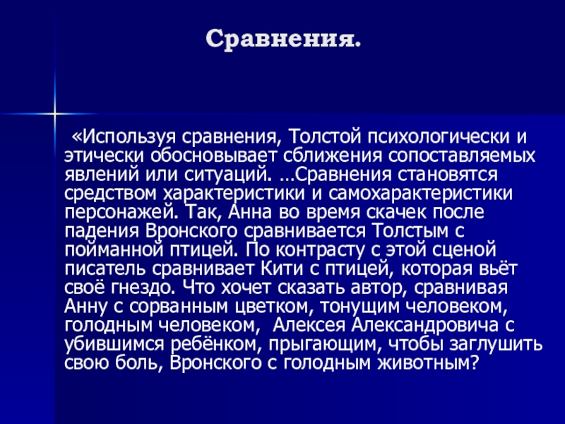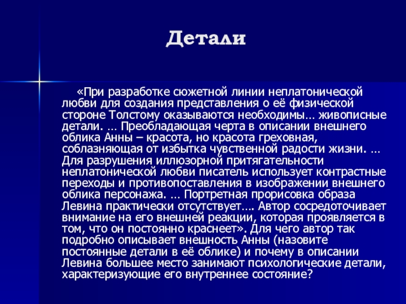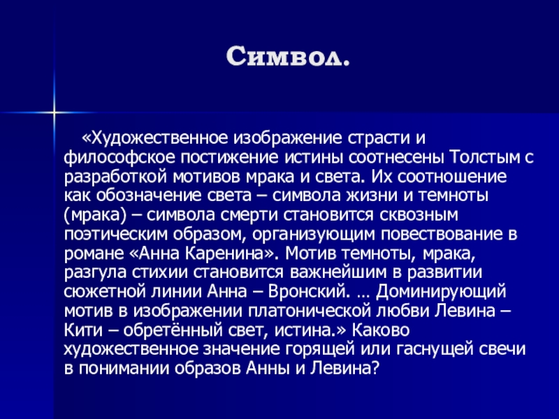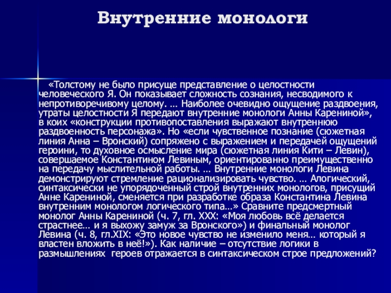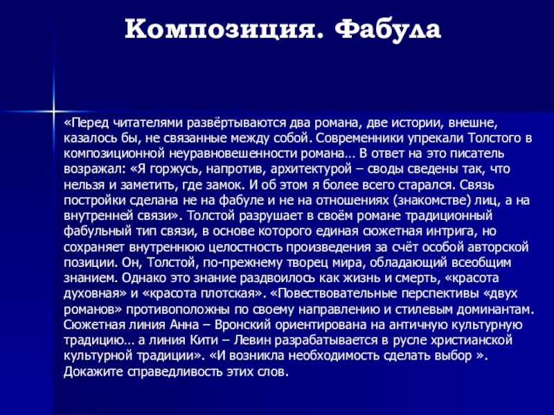 «Ну, так что же я сделаю? Как я сделаю это?» - сказал он себе, стараясь выразить для самого себя всё то, что он передумал и перечувствовал в эту короткую ночь. Всё, что он передумал и перечувствовал, разделялось на три отдельные хода мысли. Один – это было отречение от своей старой жизни, от своих бесполезных знаний, от своего ни к чему не нужного образования. Это отреченье доставляло ему наслажденье и было для него легко и просто. Другие мысли и представления касались той жизни, которою он желал жить теперь. Простоту, чистоту, законность этой жизни он ясно чувствовал и был убеждён, что он найдёт в ней то удовлетворение, успокоение и достоинство, отсутствие которых он так болезненно чувствовал. Но третий ряд мыслей вертелся на вопрос о том, как сделать этот переход от старой жизни к новой. И тут ничего ясного ему не представлялось. … Впрочем, я не спал всю ночь, и я не могу дать себе ясного отчёта, - сказал он себе. – Я уясню после. Одно верно, что эта ночь решила мою судьбу. Все мои прежние мечты семейной жизни вздор, не то, - сказал он себе. – Всё это гораздо проще и лучше…»