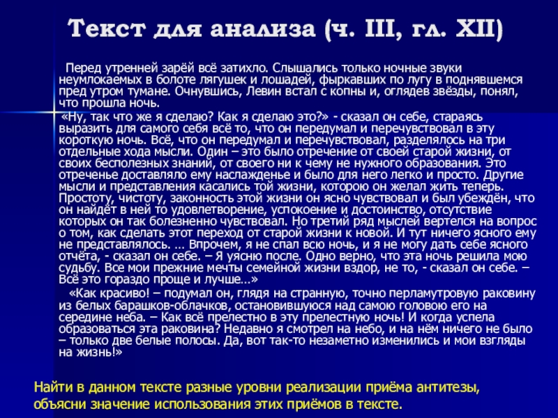 Найти в данном тексте разные уровни реализации приёма антитезы, объясни значение использования этих приёмов в тексте.