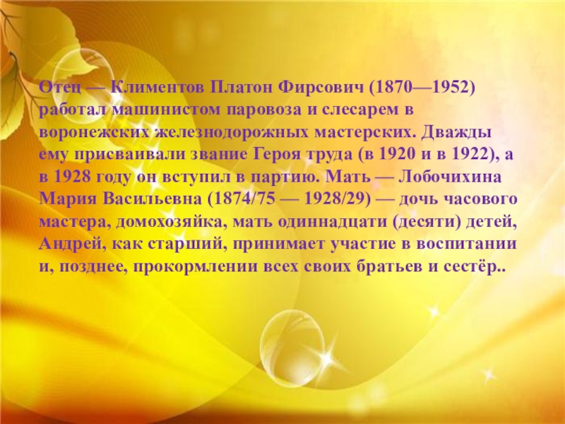 Слайд 9Отец — Климентов Платон Фирсович (1870—1952) работал машинистом паровоза и слесарем в
