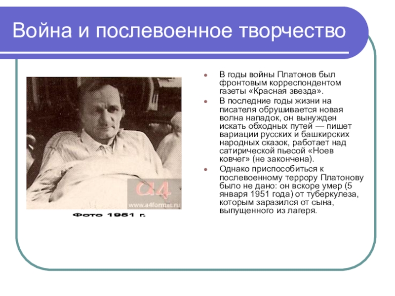 Однако приспособиться к послевоенному террору Платонову было не дано: он вскоре умер (5 января 1951 года) от туберкулеза, которым заразился от сына, выпущенного из лагеря.