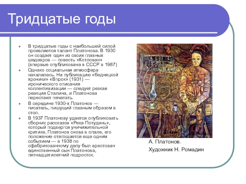 В тридцатые годы с наибольшей силой проявляется талант Платонова. В