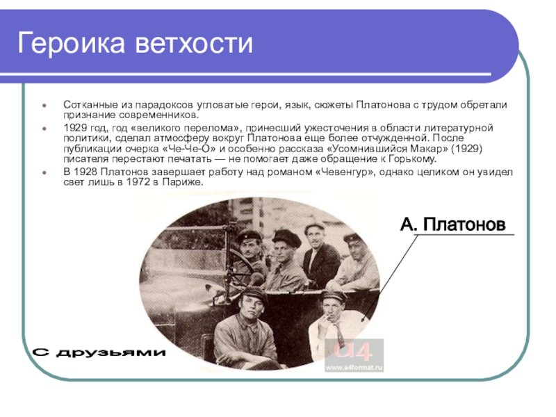 1929 год, год «великого перелома», принесший ужесточения в области литературной политики, сделал атмосферу вокруг Платонова еще более отчужденной. После публикации очерка «Че-Че-О» и особенно рассказа «Усомнившийся Макар» (1929) писателя перестают печатать — не помогает даже обращение к Горькому.