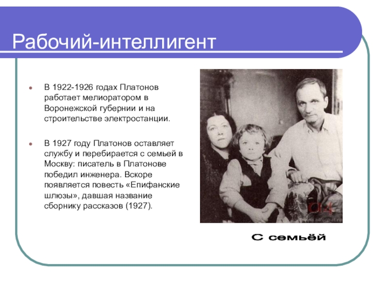 В 1922-1926 годах Платонов работает мелиоратором в Воронежской губернии и на