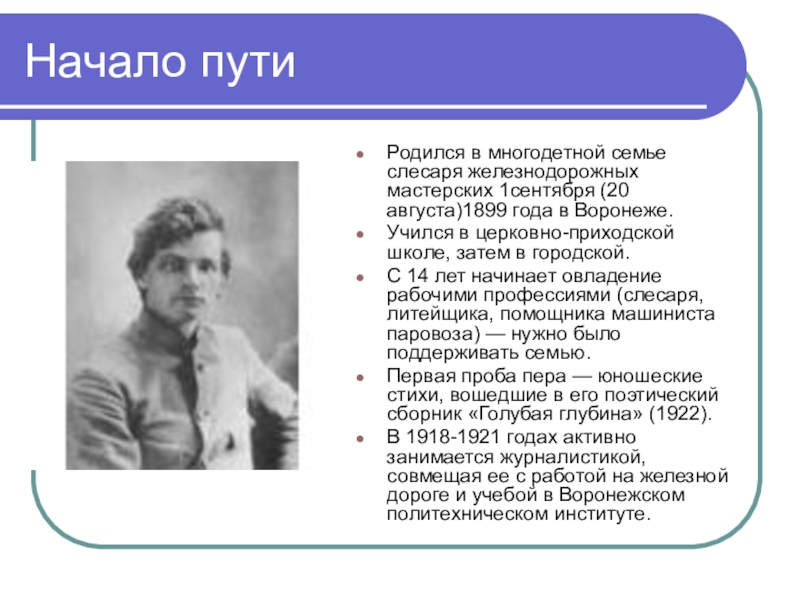 В 1918-1921 годах активно занимается журналистикой, совмещая ее с работой на железной дороге и учебой в Воронежском политехническом институте.