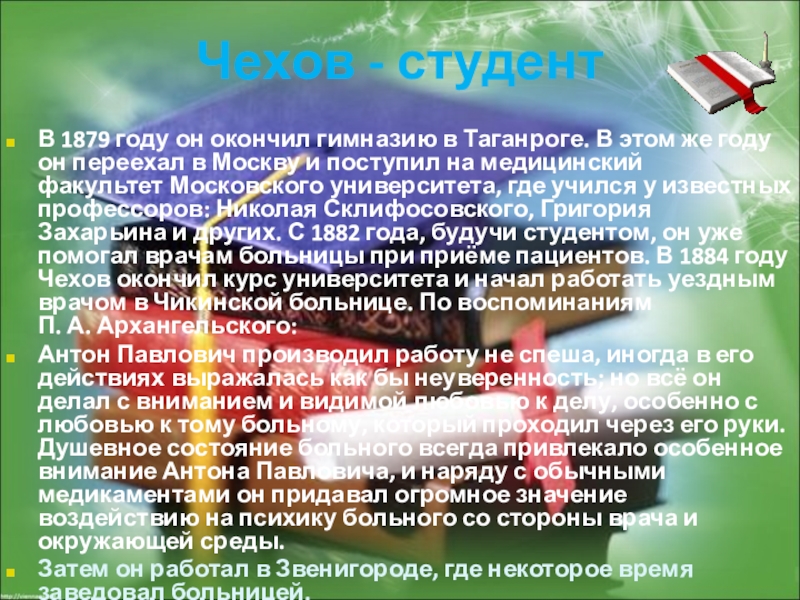 году он переехал в Москву и поступил на медицинский факультет Московского университета, где учился у известных профессоров: Николая Склифосовского, Григория Захарьина и других. С 1882 года, будучи студентом, он уже помогал врачам больницы при приёме пациентов. В 1884 году Чехов окончил курс университета и начал работать уездным врачом в Чикинской больнице. По воспоминаниям П. А. Архангельского: