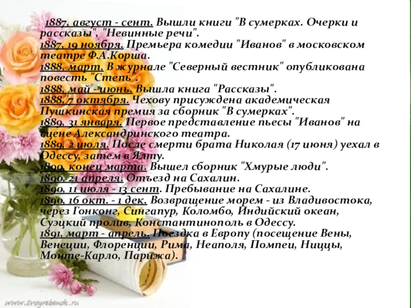 Слайд 20 1887, август - сент. Вышли книги "В сумерках. Очерки и рассказы",