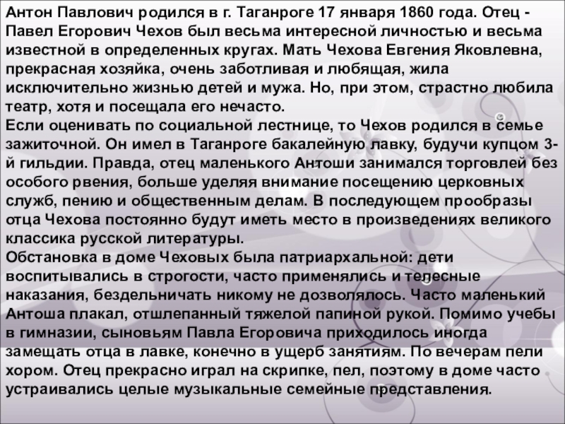 в Таганроге бакалейную лавку, будучи купцом 3-й гильдии, но занимался торговлей без особого рвения, больше уделяя внимание посещению церковных служб, пению и общественным делам. Обстановка в доме Чеховых была традиционно - патриархальной: дети воспитывались в строгости, часто применялись и телесные наказания, бездельничать никому не дозволялось. Помимо учебы в гимназии, сыновьям Павла Егоровича приходилось иногда замещать отца в лавке, конечно в ущерб занятиям. По вечерам пели хором. Отец прекрасно играл на скрипке, пел, Маша аккомпанировала на фортепиано, в общем, устраивались целые музыкальные семейные представления.