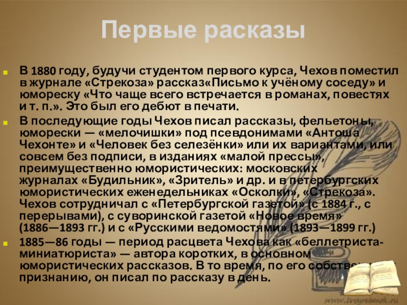 В последующие годы Чехов писал рассказы, фельетоны, юморески — «мелочишки» под псевдонимами «Антоша Чехонте» и «Человек без селезёнки» или их вариантами, или совсем без подписи, в изданиях «малой прессы», преимущественно юмористических: московских журналах «Будильник», «Зритель» и др. и в петербургских юмористических еженедельниках «Осколки», «Стрекоза». Чехов сотрудничал с «Петербургской газетой» (с 1884 г., с перерывами), с суворинской газетой «Новое время» (1886—1893 гг.) и с «Русскими ведомостями» (1893—1899 гг.)