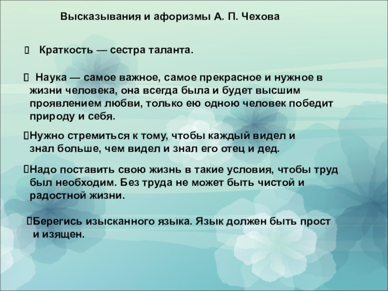 Слайд 5Высказывания и афоризмы А. П. Чеховa