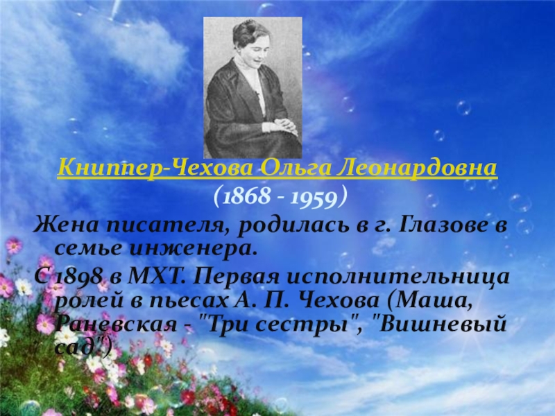 С 1898 в МХТ. Первая исполнительница ролей в пьесах А. П. Чехова (Маша, Раневская - "Три сестры", "Вишневый сад")