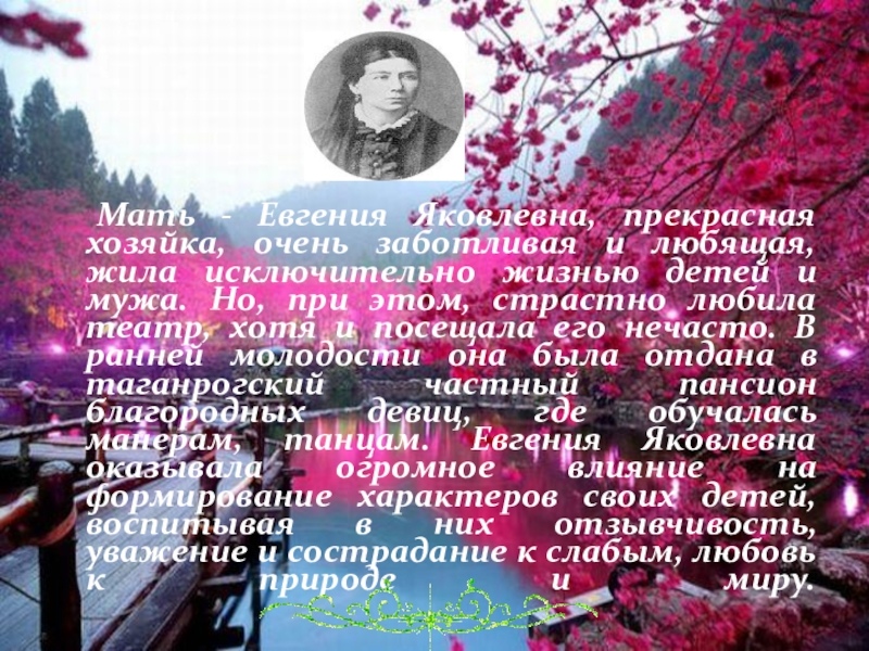 исключительно жизнью детей и мужа. Но, при этом, страстно любила театр, хотя и посещала его нечасто. В ранней молодости она была отдана в таганрогский частный пансион благородных девиц, где обучалась манерам, танцам. Евгения Яковлевна оказывала огромное влияние на формирование характеров своих детей, воспитывая в них отзывчивость, уважение и сострадание к слабым, любовь к природе и миру.