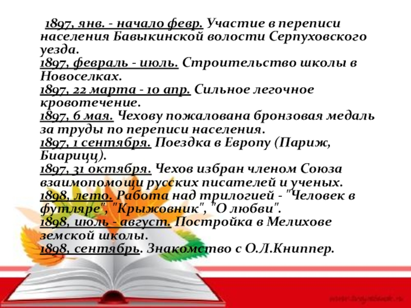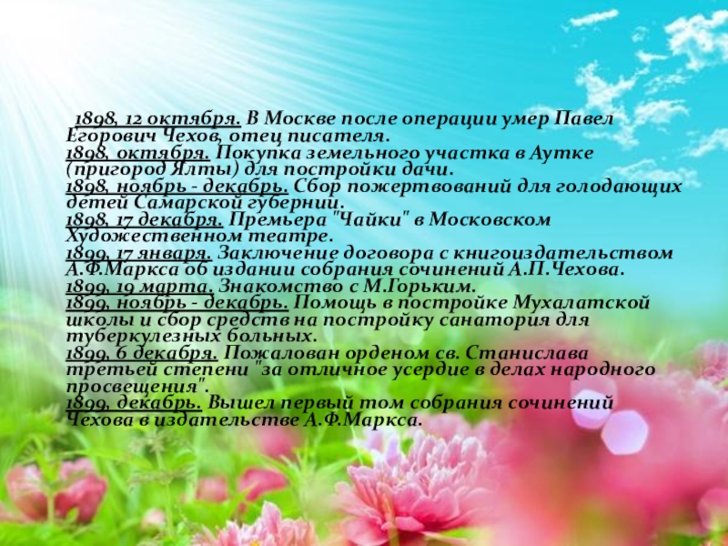 1898, лето. Работа над трилогией - "Человек в футляре", "Крыжовник", "О любви".