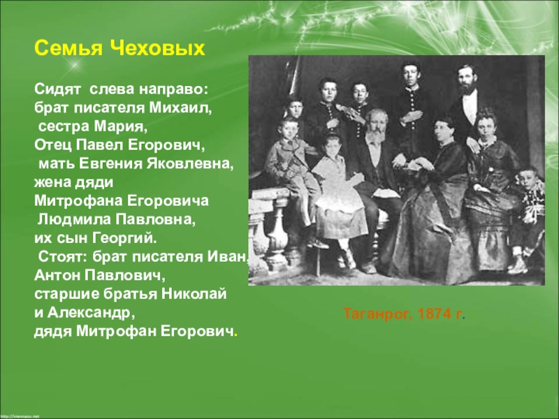 - Павел Егорович Чехов был весьма интересной личностью и весьма известной в определенных кругах. Мать Чехова Евгения Яковлевна, прекрасная хозяйка, очень заботливая и любящая, жила исключительно жизнью детей и мужа. Но, при этом, страстно любила театр, хотя и посещала его нечасто.